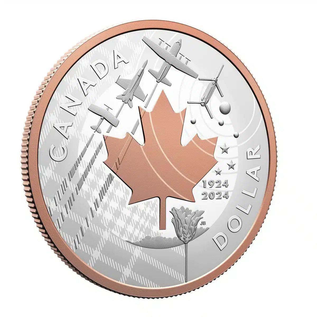 The 2024 Fine Silver Proof Dollar honours the RCAF’s history and legacy during its centennial year (“1924-2024”), and this seven-piece set contains an exclusive version of the collector coin. Instead of traditional (yellow) gold plating, an application of rose gold adds colour to the RCAF roundel’s maple leaf and the rim on the coin’s reverse.