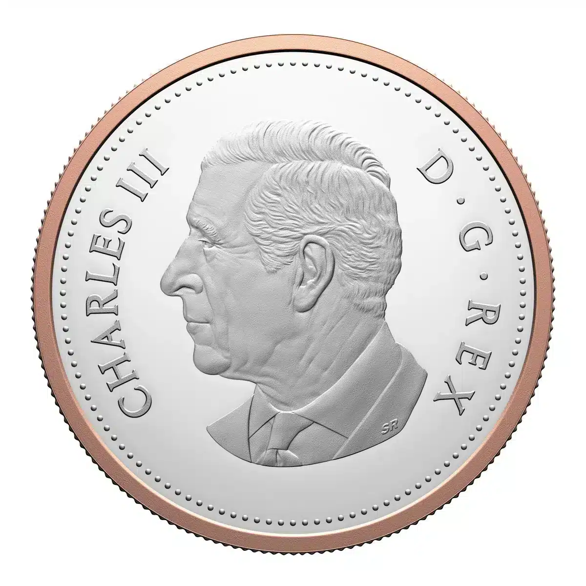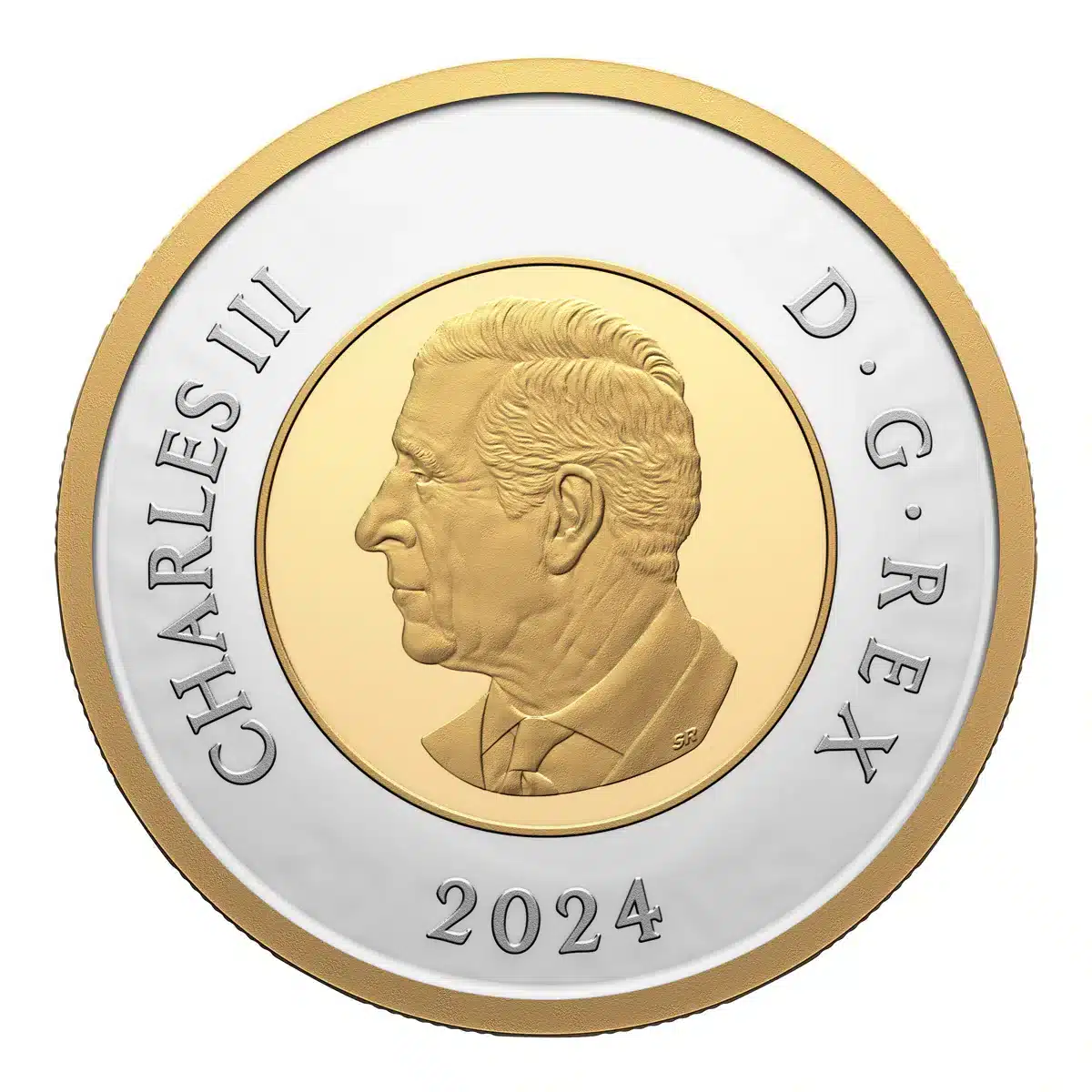 The RCAF’s future and its space division are represented by the planets and orbital rings, with the two outermost rings running across the maple leaf to represent the centennial years “1924” and “2024” (and all that has been achieved between these centennial dates); the stars honour the RCAF’s current inspirational motto, Sic Itur ad Astra (“Such is the pathway to the stars”). At the bottom, the flaming parrot tulip (representing “Rescue”) is one of four tulip bulb types specially selected to commemorate the RCAF’s Centennial in gardens across Canada and at the Canadian Tulip Festival in 2024. The obverse features the effigy of His Majesty King Charles III by Canadian artist Steven Rosati.