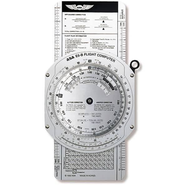 The best slide-rule-style flight computer on the market, with solid aluminum construction and easy-to-read lettering. ASA’s E6-B features a wind component grid and comprehensive crosswind correction chart, and on the other side the slide computes time, speed, distance, altitude, true airspeed, and density altitude problems as well as conversions. Nautical and statute scales are included.