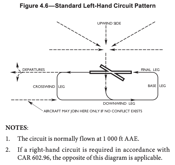 The above photo was taken from the AIM and will be used to generally illustrate our point which related to legalities. The above photo is the most accepted way of joining a circuit at an uncontrolled aerodrome in Canada. There are a few things to note in the photo. The first note states that the circuit is normally flown at 1,000 ft above aerodrome elevation. This is not a law.